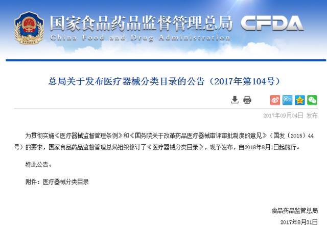 距CFDA发布新版《医疗器械分类目录》过去了将近1年的缓冲时间,按照之前的公示:新版《医疗器械分类目录》将在2018年8月1日正式实施。