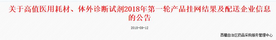 而同一天发布的《公告》中,则公布了西藏自治区2018年第一轮高值医用耗材、体外诊断试剂集中挂网阳光采购产品,以及相关配送企业名单。