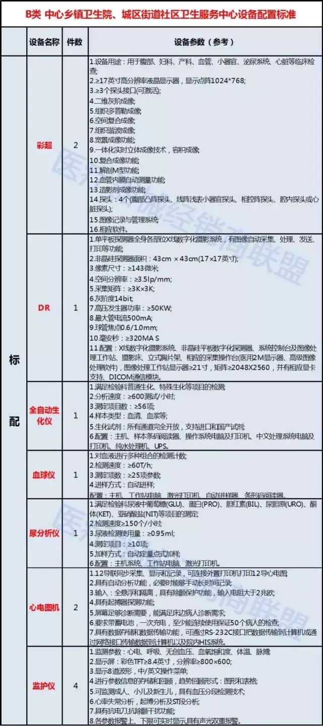 《通知》中公布的这两类医疗机构的建设新标准,对于设备配置也做出明确要求。并且明确力争使乡镇卫生院和社区卫生服务中心的服务能力达到基本标准,部分服务能力较强的乡镇卫生院和社区卫生服务中心达到推荐标准。