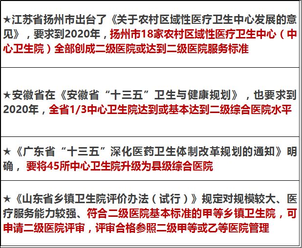 为了搭上中央财政的便车,强化卫生院服务能力,把符合条件的乡镇卫生院升级为二级医院成为一种新的改革路径,各省在这方面也开始大力改革,比如: